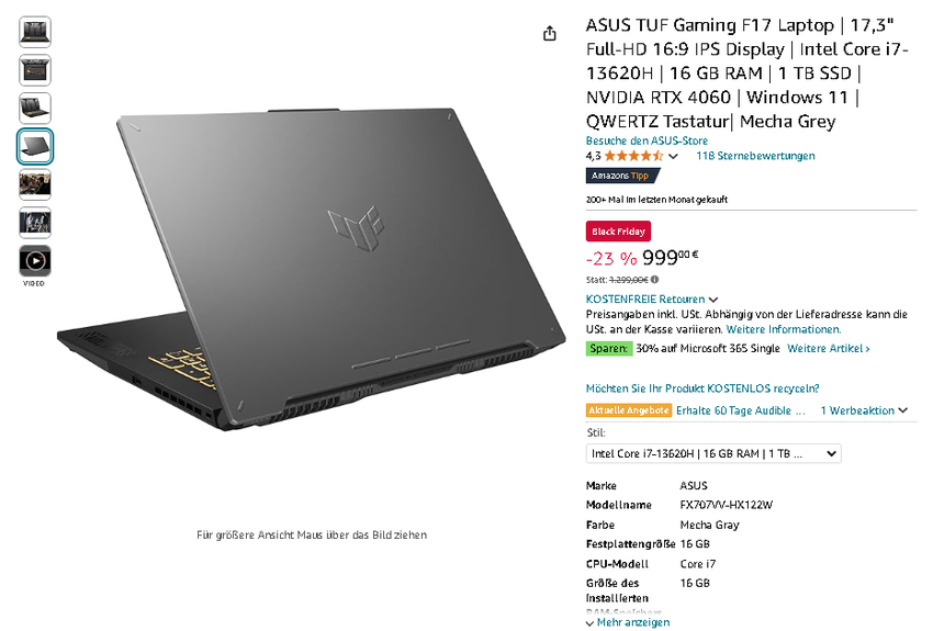 Der ASUS TUF Gaming F17 ist momentan für 999,00 € statt 1.299,00 € erhältlich - Sie sparen unglaubliche 23%! Eine Gelegenheit, die Gaming-Enthusiasten nicht verpassen sollten.