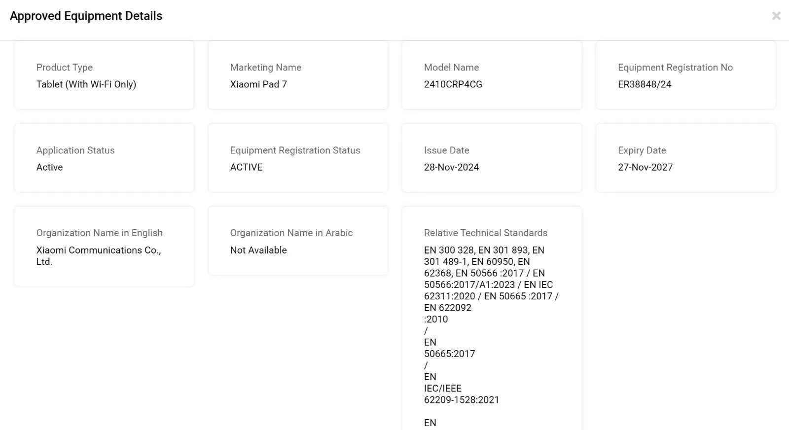 Es wird auch berichtet, dass die Tablets Xiaomi Pad 7 und Xiaomi Pad 7 Pro die TDRA-Zertifizierung bestanden haben und neben dem Xiaomi 15 vorgestellt werden könnten. Die Zertifizierung bestätigt die Modellnummern 2410CRP4CG und 24091RPADG und ihre Markennamen.