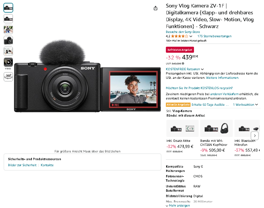 Die innovative Vlog-Kamera ist momentan für 439,00€ statt 649,00€ verfügbar - das bedeutet 32% Ersparnis!