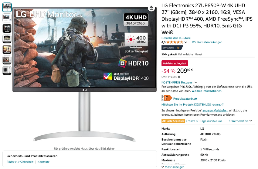 Screenshot der LG 27UP650P-W. Quelle: Amazon