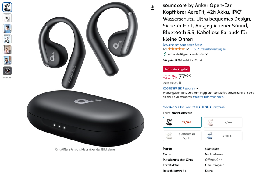 Mit ihrer Kombination aus innovativer Open-Ear-Technologie, hochwertigem Sound und dem attraktiven Aktionspreis sind die soundcore AeroFit eine ausgezeichnete Wahl für alle, die Musik genießen möchten, ohne sich von ihrer Umgebung abzuschotten.