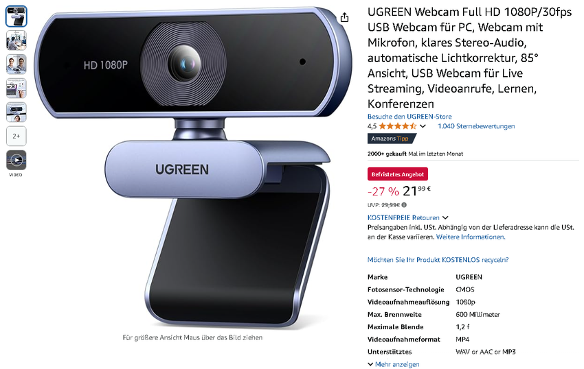 Die UGREEN Full HD Webcam ist momentan für 21,99 € statt 29,99 € erhältlich - das entspricht einer Ersparnis von 27%!