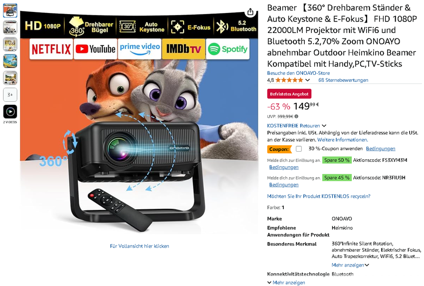 Hier wird es richtig spannend: Der ONOAYO AY3 Beamer kostet aktuell nur 149,99 € statt regulär 399,99 € – das sind unglaubliche 63% weniger! Bei diesem Preis müssen Sie wirklich schnell sein.