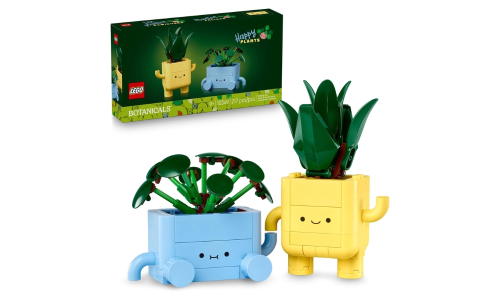 Die LEGO Botanicals Happy Plants bestehen aus 217 Teilen, aus denen zwei Pflanzentöpfe mit Cartoon-Gesichtern gebaut werden können. Die Baby-Dracaena ist 4,5 Zoll groß, während die Baby-Pilea 3 Zoll groß ist. Die gelben und blauen Töpfe haben bewegliche Arme, die die Hände halten können. Bedruckte Gesichtsschilder vermeiden Aufkleber. Wenn man die Pflanzen anhebt, kommen winzige Wurzelsysteme darunter zum Vorschein.