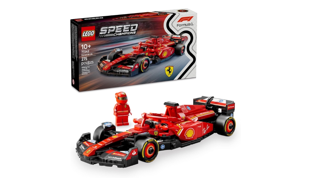 Der LEGO Speed Champions Ferrari SF-24 ist eine Nachbildung des Formel-1-Rennwagens aus dem Jahr 2024 im Maßstab einer 8 breiten Minifigur. Das 275-teilige Set zeigt die rote Ferrari-Lackierung mit Sponsorenlogos, aerodynamischen Flügeln und Open-Wheel-Design. Eine Rennfahrer-Minifigur mit bedrucktem Anzug und Helm vervollständigt das Paket. Die Bauzeit beträgt 45-60 Minuten.