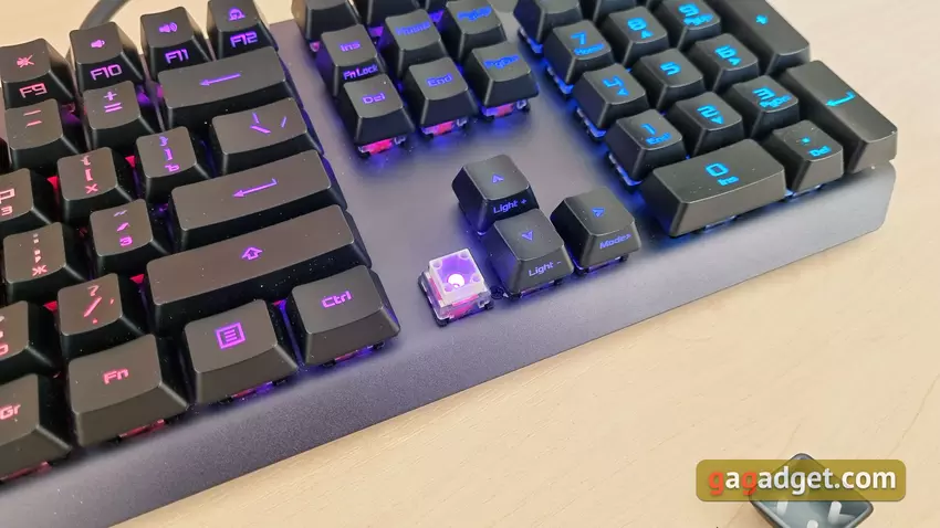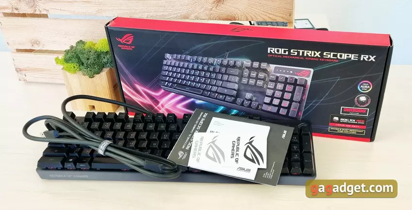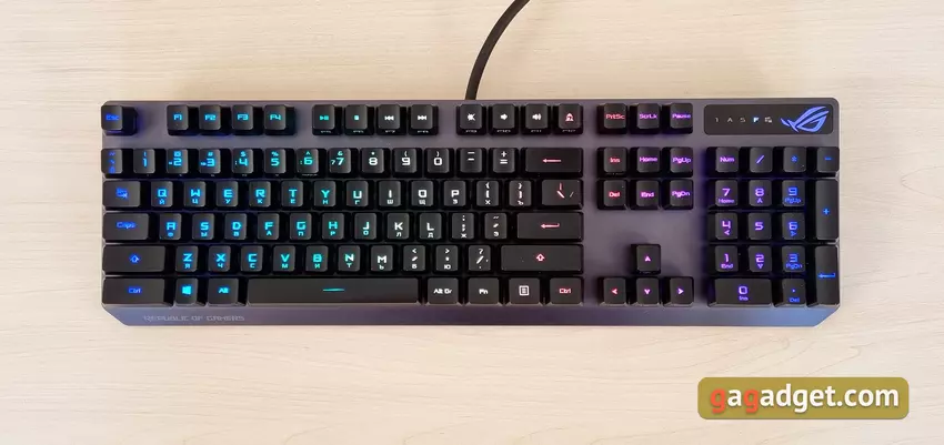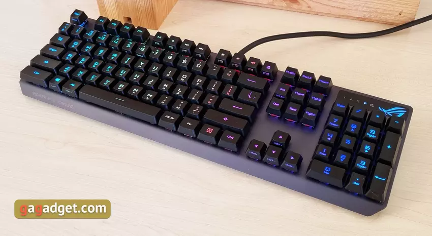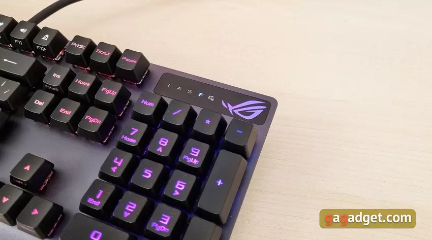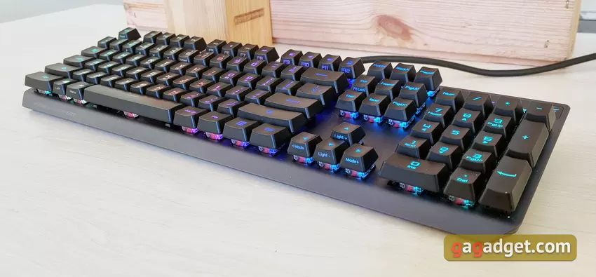 Bei der Montage gibt es keine Beanstandungen: Das ASUS ROG Strix Scope RX ist wunderschön verarbeitet. Alles passt perfekt, die Konstruktion ist sehr steif, verbiegt nicht und "knirscht" nicht. Dazu kommt der Staub- und Wasserschutz nach dem IP56-Standard. Die Spezifikation besagt, dass eine gewisse Menge an Staub in die Struktur eindringen kann, aber den Betrieb des Geräts nicht beeinträchtigen wird. Und auch die Tastatur hat keine Angst vor direkten starken Wasserspritzern. Die ASUS ROG Strix Scope RX geht also nicht kaputt, wenn Sie versehentlich Tee darauf schütten.