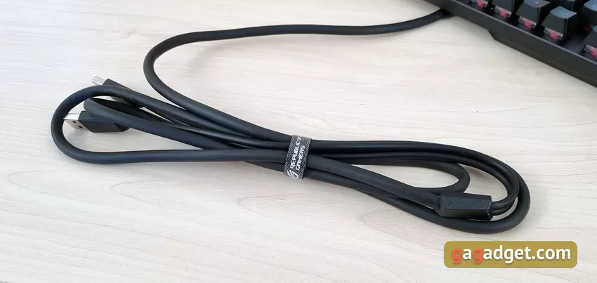 Das Kabel ist recht dick und hat zwei Stecker. Der zweite Stecker ist für den USB-Pass-Through. Statt der von Gaming-Tastaturen gewohnten Stoffisolierung wird eine aus Silikon verwendet. Das Kabel ist etwas weniger flexibel, aber in diesem Fall spielt das keine Rolle. Es ist kaum ein Szenario denkbar, in dem die Tastatur ständig über den Tisch gezogen werden muss.