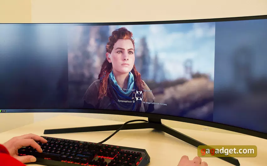 Nach unserer persönlichen Erfahrung sieht es in den meisten Fällen cool aus, obwohl es einen minimalen Unschärfe-Effekt an den Bildrändern gibt. Sie sollten aber verstehen, dass der Wow-Effekt nicht bei allen Spielen vorhanden ist. In erster Linie ist dieser Monitor perfekt für Ego-Shooter und Simulatoren. Obwohl es durchaus sinnvoll ist, auch in den Strategien viel mehr Platz zu bekommen. Die meisten modernen Spiele unterstützen bereits solche "verlängerten" Monitore, aber bei älteren Spielen wird es an den Seiten schwarze Balken geben. Und Zwischensequenzen in manchen Spielen sehen dann so aus: