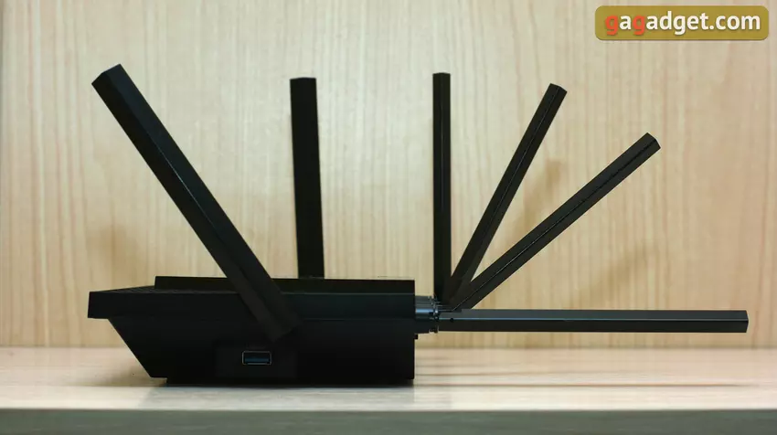 Auf der rechten Seite befinden sich ein USB-3.0-Typ-A-Anschluss und eine der Antennen. Wenn Sie ein USB-Flash-Laufwerk als Netzwerkspeicher verwenden wollen, ist die seitliche Platzierung meist praktischer als die hintere: Wenn Sie das Laufwerk entfernen müssen, brauchen Sie es nicht zwischen den Netzwerkkabeln zu suchen. Eine weitere Antenne befindet sich an der linken Seite des Routers. Der Kunststoff ist überall matt und nicht klebrig.