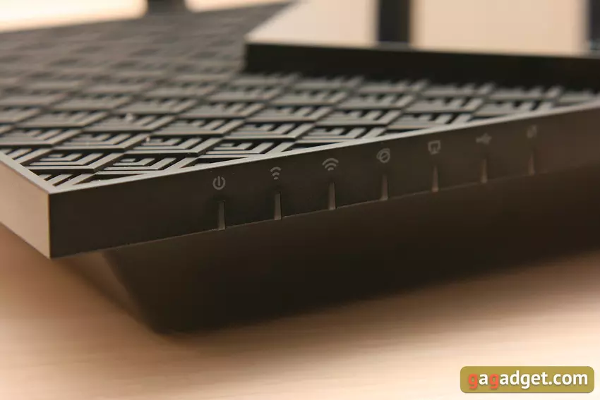 Das Gitter selbst, das den Rest des Panels abdeckt, ist ebenfalls schön, es bildet ein mehrstufiges Relief und besteht aus mattem Kunststoff. Es soll für eine gute Belüftung des Routers sorgen, lässt sich aber schwerer von Staub befreien als eine ebene Fläche.