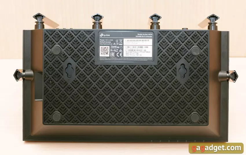 Die Unterseite des Gehäuses ist mit dem gleichen Relief-Lüftungsgitter abgedeckt wie die Oberseite. In den Ecken befinden sich gummierte Standfüße, und auch die Halterungen für die Wandmontage des Geräts wurden nicht vergessen. Wie immer gibt es einen Aufkleber mit dem Namen der SSID und dem Standardpasswort.