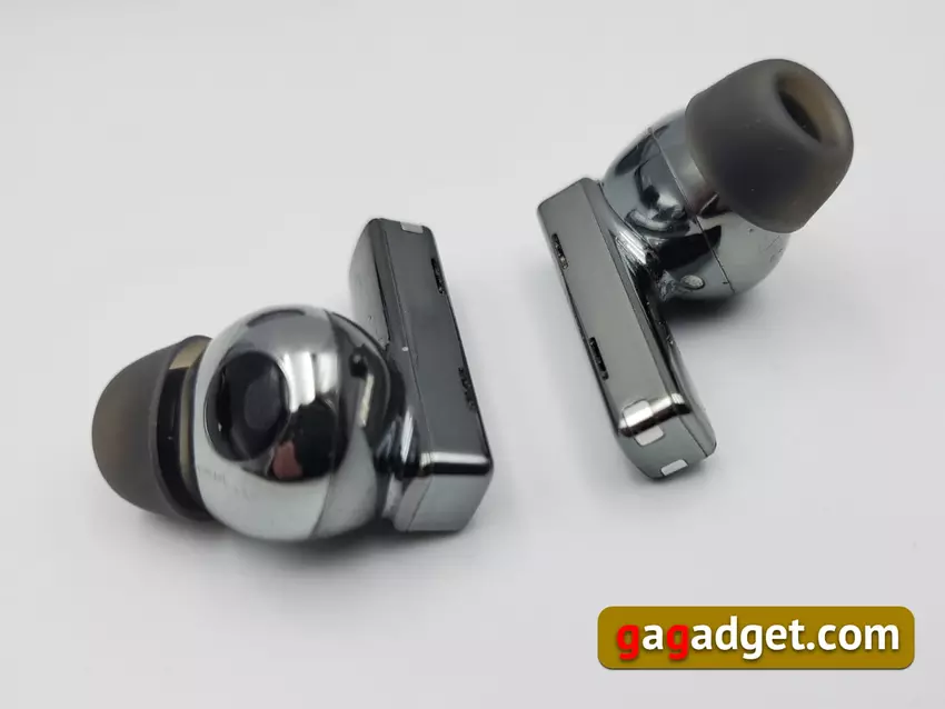 Die Kopfhörer von Samsung sind kleiner, haben aber zwei Ladekontakte (die Metallkreise auf der rechten Seite des Kopfhörers im Bild), dazwischen einen Näherungssensor (damit kann man feststellen, dass der Kopfhörer vom Ohr entfernt ist, und die Musik pausieren). Außerdem gibt es drei Mikrofone, einen Knochenleitfähigkeitssensor, zwei Lautsprecher (einen 11-mm-Tieftöner und einen 6,5-mm-Hochtöner) und drei Luftungslöcher. Zwei davon haben Mikrofonen und eine (an der Innenseite der Hörmuschel) ist für Reduzierung der Okklusion, d. h. der Verzerrung der eigenen Stimme durch den eng überlappenden Gehörgang. Außerdem befinden sich ein Prozessor und eine Batterie inerhalb der Hörmuschel, ohne dass andere zugehörige Elektronik mitgerechnet werden.