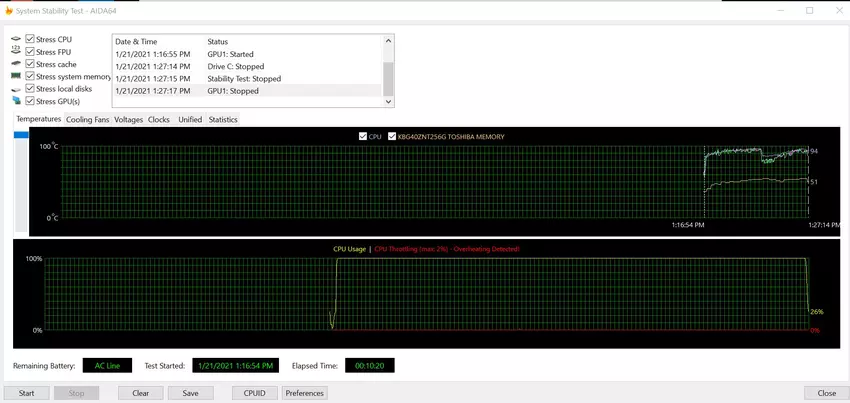 Der Intel Core i5-L16G7 ist ein sehr energieeffizienter Prozessor und das Kühlsystem ist fast nie zu hören. Offenbar läuft der Lüfter nur bei maximaler Last. Zum Beispiel im AIDA64-Stresstest. Dabei überhitzt der Prozessor nicht, drosselt nicht und das Geräusch des Lüfters ist nur dann zu hören, wenn man sein Ohr in die Nähe des Lüfters bringt.