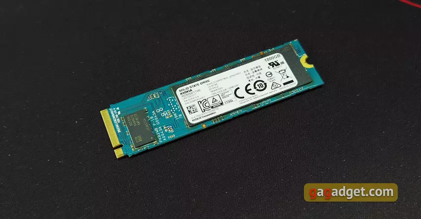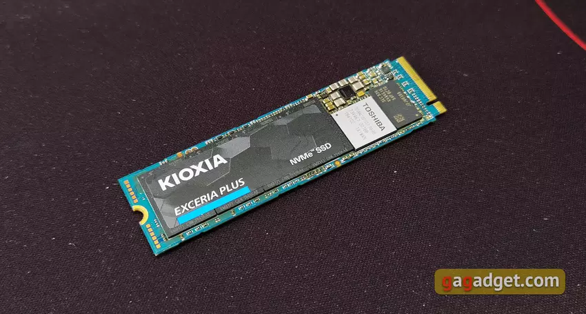 Die Kioxia Exceria Plus ist eine typische M.2-SSD im 2280er-Formfaktor mit PCI Express 3.0 x4-Schnittstelle. Im Gegensatz zu einigen Top-Gaming-Modellen ist kein zusätzlicher Kühlkörper vorhanden. Auf der Vorderseite befindet sich ein Aufkleber mit dem Namen des Modells, darunter befinden sich vier Toshiba-Flash-Chips. Daneben befindet sich ein Controller, ebenfalls von Toshiba. Und etwas rechts daneben - ein DRAM-Cache-Chip. Laut Google - hergestellt von Samsung.