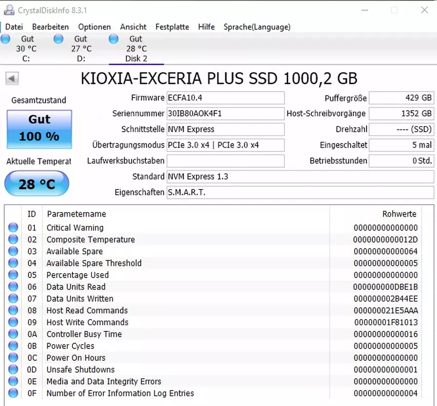 Nach dem oben beschriebenen Schreibvorgang haben wir die Laufwerkstemperatur im Inneren unseres Test-PCs gemessen und sie lag bei 28 °C. Natürlich wird die Temperatur in manchen Laptops mit begrenztem Platzangebot deutlich höher sein, aber es gibt keine Voraussetzungen für eine Überhitzung.