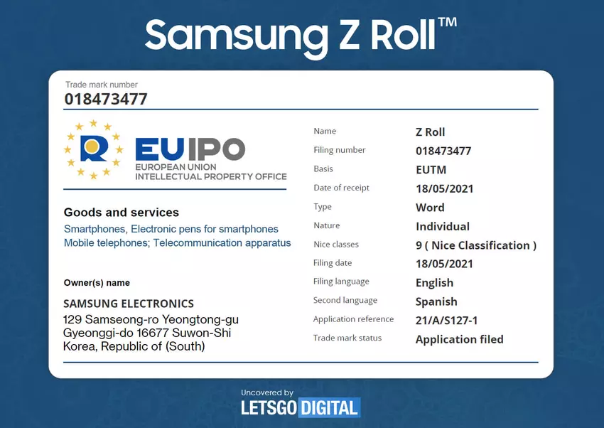 Nach Angaben von LetsGoDigital hat das Unternehmen den Namen Galaxy Z Roll beim Amt der Europäischen Union für geistiges Eigentum (EUIPO) registriert. Höchstwahrscheinlich wird dies auch der Name des Geräts sein. Es gibt noch keine genauen Daten für die Veröffentlichung der neuen Geräte, aber es heißt, dass das Smartphone Ende dieses Jahres oder Anfang nächsten Jahres vorgestellt wird.
