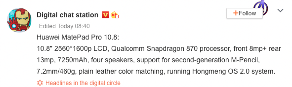 Die Neuheit wird außerdem mit 8 GB RAM, 128/256 GB internem Speicher, 8-MP-Frontkamera, 13-MP-Hauptkamera, 7250-mAh-Akku und Unterstützung für den M-Pen-Stift der zweiten Generation erwartet. Das Tablet soll out of the box mit HarmonyOS 2.0 vorinstalliert sein.