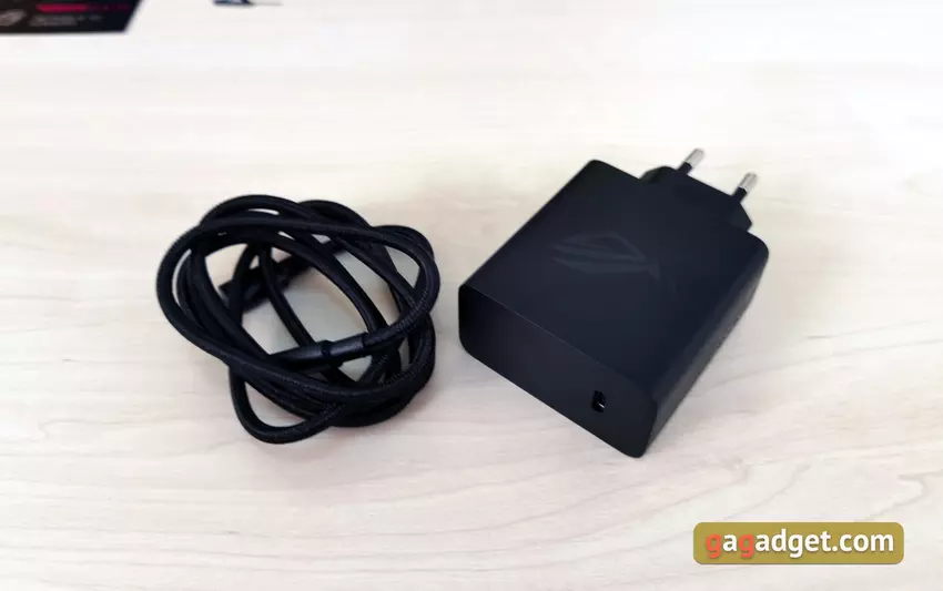 Aber kommen wir nun zum Lieferumfang. Neben dem Smartphone selbst enthält die Box einen seltsam geformten Schutzbumper aus Kunststoff, ein sehr beeindruckendes 65-Watt-Netzteil, ein stoffummanteltes Type-C-Kabel, einen Ersatzstecker für die seitlichen Anschlüsse, einen Tablettentnahmeclip, einen Satz Aufkleber und eine Dokumentation.