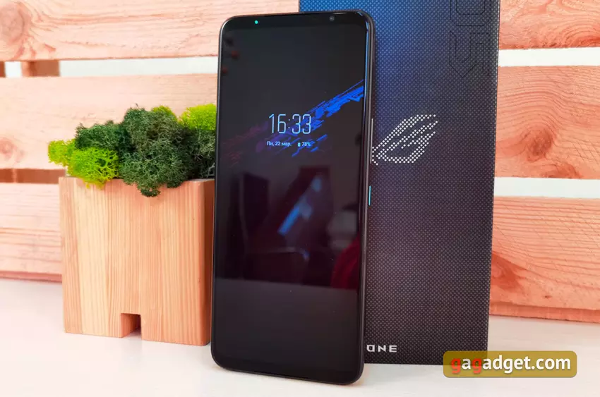 Das ASUS ROG Phone 5 sieht ziemlich einzigartig aus. Naja, so sehr wie es in der heutigen Realität sein kann. Es ist groß und sehr schwer: 8,4 oz (238 Gramm) sind kein Witz. Das Gehäuse ist aus Glas und Metall gefertigt. An der Vorderseite befindet sich ein großer Bildschirm mit abgerundeten Ecken und ohne Ausschnitte. ASUS hat sich entschieden, mobilen Gamern keinen nützlichen Platz wegzunehmen. Gleichzeitig sind die Aussparungen unterhalb und oberhalb des Bildschirms absolut symmetrisch, so dass es sehr ästhetisch aussieht.