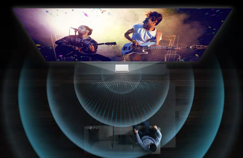 | Samsung The Premiere 40-Watt, 4.2-Kanal-Lautsprecher, die im Gehäuse des Projektors untergebracht sind, können problemlos mit dem integrierten Lautsprechersystem eines guten Fernsehers mithalten. Die Acoustic-Beam-Technologie verwendet 22 nach oben, links und rechts gerichtete Löcher, die einen atemberaubenden Surround-Sound liefern, der den gesamten Raum für eine realistische Wiedergabe ausfüllt. |