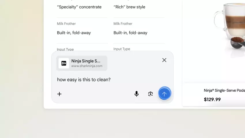 Zum Beispiel, wenn Sie ein Produkt auswählen, wie eine Kaffeemaschine, kann der Benutzer zur Website des Herstellers gehen und sofort den AI-Modus nach der Benutzerfreundlichkeit der Reinigung oder anderen Eigenschaften fragen, ohne den Modellnamen anzugeben. Der Assistent versteht in diesem Fall, welches Produkt gemeint ist.