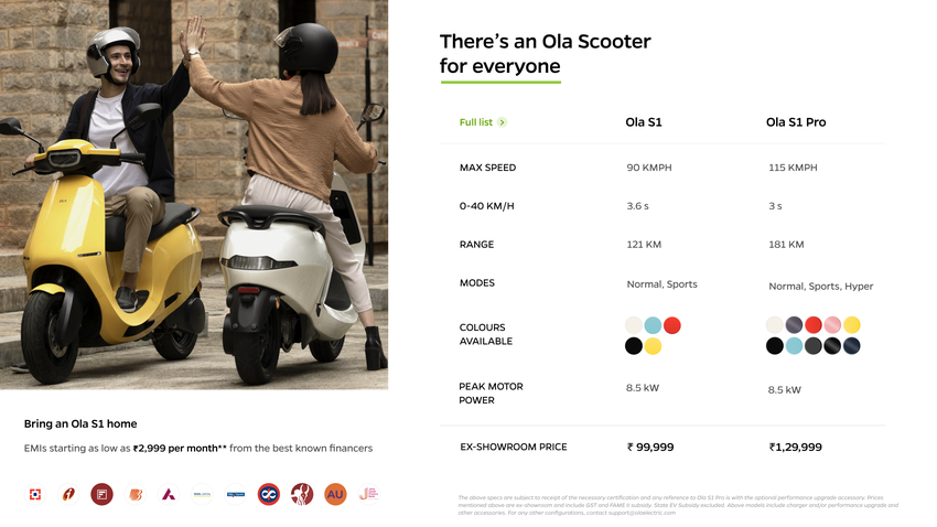 Die neuen Modelle sind vorne mit Monodämpfern und hinten mit Scheibenbremsen ausgestattet. Beide Modelle werden mit 110/70-R12 MRF-Reifen geliefert. Das Basismodell des Ola S1 verfügt über einen Hyperdrive-Motor mit 8,5 kW. Er ist in der Lage, den Roller in 3,6 Sekunden von 0 auf 40 km/h zu beschleunigen. Die Höchstgeschwindigkeit wird mit 90 km/h angegeben. Angetrieben von einer 2,98-kWh-Batterie. Eine Ladung reicht nach Angaben des Unternehmens für 121 km. Die Version Ola S1 Pro hat den gleichen Motor , aber die Beschleunigung auf 40 km/h beträgt bereits 3 Sekunden und die Höchstgeschwindigkeit 115 km/h. Diese Version wird von einer 3,97 kWh-Batterie angetrieben. Mit einer einzigen Ladung kann der Ola S1 Pro bis zu 181 km weit fahren. Die Batterien des Scooters können mit 750-W-Ladestationen aufgeladen werden (von 0 auf 75% in 15 Minuten).