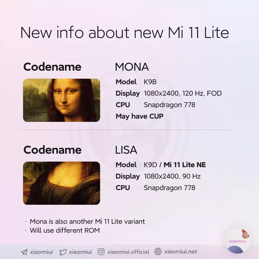 Das zweite Xiaomi Mi 11 Lite Modell hört auf den Codenamen Mona. Sein kommerzieller Name ist noch nicht festgelegt worden. Auch das Smartphone wird mit einem Snapdragon 778 und einem FHD+ Display ausgestattet sein. Der biometrische Sensor wird unter dem Display platziert, was durch das Akronym FOD (Fingerprint on Display) angezeigt wird.