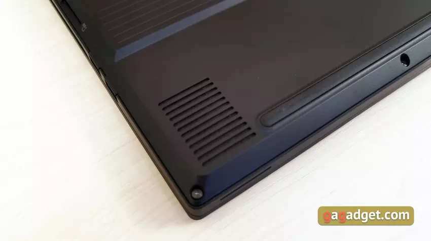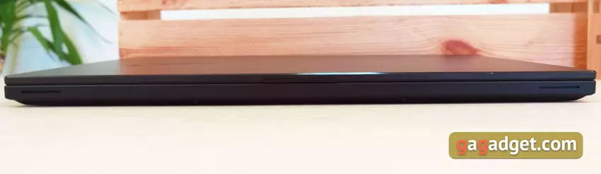 An der hinteren Kante des Laptops befinden sich Lüftungsöffnungen. Daneben befindet sich auf der Oberseite ein breiterer Ausschnitt, in dem zwei der sechs integrierten Lautsprecher und LED-Aktivitätsleuchten untergebracht sind.