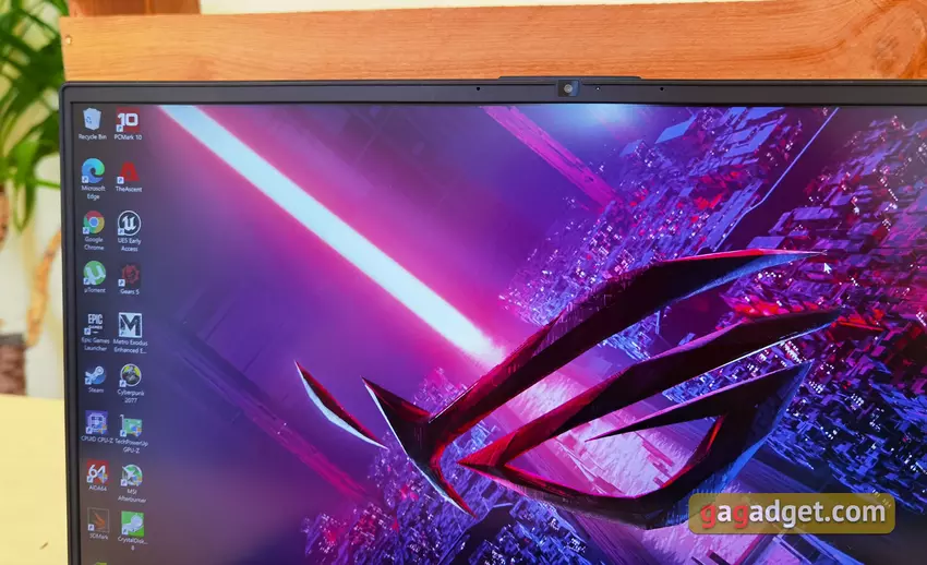 Die Ränder um den Bildschirm herum sind recht dünn, vor allem wenn man bedenkt, dass es sich um ein Gaming-Modell handelt. Gleichzeitig gibt es im Gegensatz zu einigen Zephyrus-Modellen eine Webcam mit Mikrofonen, und zwar an der üblichen Stelle.