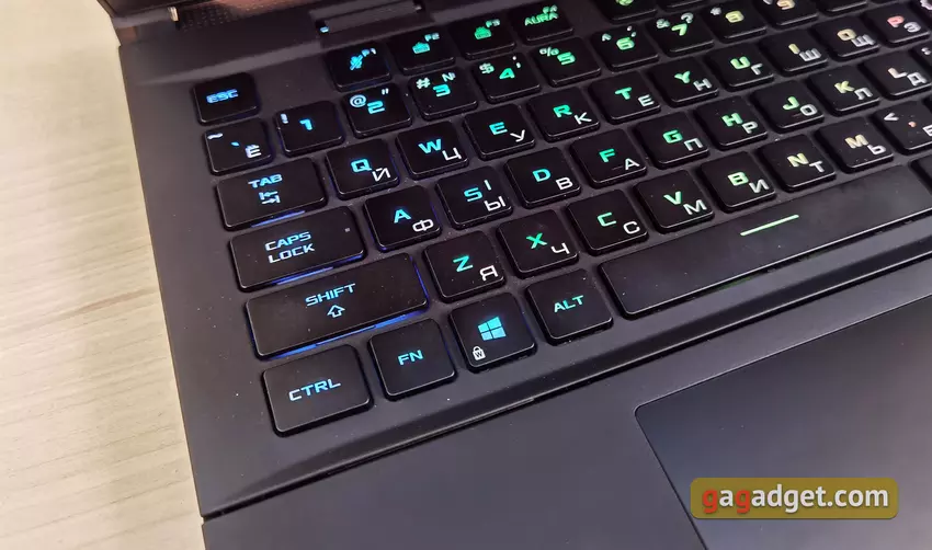 Das Layout des ASUS ROG Zephyrus S17 GX703 ist vollwertig, wenn auch nicht ganz Standard. Im Allgemeinen ist der Hauptblock vertraut: langer Shift, einstöckiger Enter. Es gibt jedoch einen zusätzlichen Nummernblock, und zwischen diesem und dem Hauptblock befinden sich die Tasten Num Lock/Delete, /, * und -. Darunter befindet sich ein separater Block von Pfeilen, der mit Home, End, PgUp, PgDown kombiniert ist. Die Funktionen sind nicht kritisch, aber es wird einige Zeit dauern, sich an sie zu gewöhnen. Ein weiteres Merkmal ist das multifunktionale Scrollrad oberhalb der Tastatur, das für verschiedene Aktionen in einer eigenen Anwendung eingerichtet werden kann. Die Standardeinstellung ist Lautstärkeregelung und Stummschaltung beim Drücken. Die Einschalttaste befindet sich rechts oberhalb der Tastatur und ist mit einem Fingerabdruckscanner kombiniert.