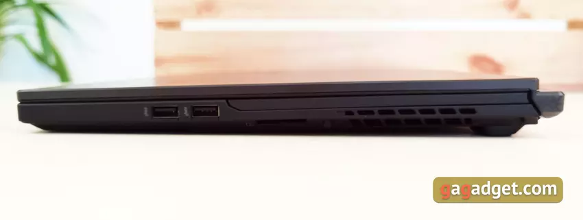 Trotz der sehr beeindruckenden Hardware im Inneren und der 17,3-Zoll-Diagonale ist das Notebook recht dünn: knapp 2 cm. Das Notebook verfügt über eine ordentliche Anzahl von Anschlüssen. Auf der linken Seite () befinden sich eine Buchse für das Netzteil, HDMI 2.0b, RJ-45 für das Netzwerk, USB-A 3.2 Gen 2 in voller Größe, Thunderbolt 4, USB-C 3.2 Gen 2 (mit DisplayPort- und Power-Delivery-Unterstützung) und eine 3,5-mm-Kombo-Audiobuchse.