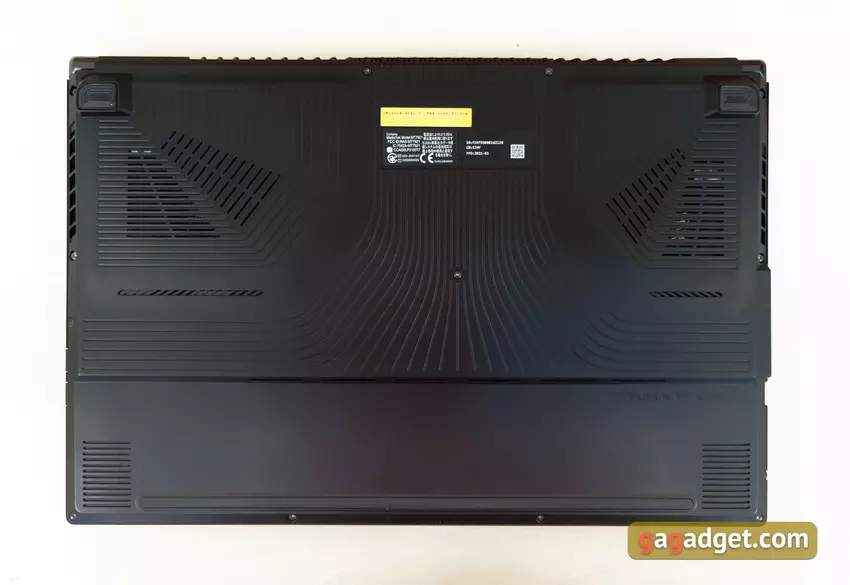 Das ASUS ROG Zephyrus S17 GX703 verwendet seit langem ein ungewöhnliches Design bei Laptops mit einer erhöhten Arbeitsfläche. Es gibt Varianten mit einem zusätzlichen erhöhten Bildschirm. Das ASUS ROG Zephyrus S17 hingegen hebt die Tastatur an, wenn das Notebook geöffnet wird. Dies geschieht, um die Kühlung der leistungsstarken Innereien des Notebooks zu verbessern. Außerdem kann die Tastatur in dieser Position bequemer angewinkelt werden. Das Notebook selbst besteht aus einer Magnesium- und Aluminiumlegierung und ist ganz in Schwarz gehalten. Und insgesamt sieht der Laptop im Gegensatz zu den meisten Gaming-Modellen nicht zu auffällig aus. Die Oberfläche hat eine Soft-Touch-Beschichtung. Es fühlt sich sehr angenehm an, sammelt aber aktiv Gebrauchsspuren. Die obere Abdeckung ist, wie bei den meisten Zephyrus-Modellen, diagonal in zwei Teile geteilt. Die Oberseite ist mit dem ROG-Logo versehen, die Unterseite mit dekorativen Perforationen.