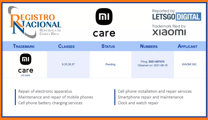 Unsere Kollegen von LetsGoDigital haben festgestellt, dass der chinesische Hersteller die Marke Xiaomi Mi Care in Costa Rica registriert hat. Daher plant der Hersteller, das Programm in den USA und Europa einzuführen. Leider gibt es noch keinen genauen Zeitplan für die Ankündigung.
