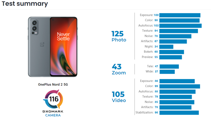 Die Fotofähigkeiten des Smartphones wurden mit 125 Punkten bewertet, während es für die Videoaufnahme 20 Punkte weniger erhielt. Getrennt davon notieren wir 37 Punkte für die Ultra-Weitwinkelkamera, 34 Punkte für den Nachtmodus und 43 Punkte für den Zoom, obwohl das OnePlus Nord 2 kein Teleobjektiv bekommen hat. Beachten Sie, dass es kein einziges Modell gibt, das in der Rangliste weiter oben steht und weniger oder mindestens genauso viel kostet.