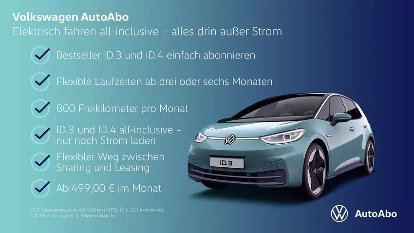 Die Abonnements beginnen bei 499 €, aber es gibt Abstufungen. Insbesondere werden nur ID.3 und der Tarif AutoAbo Plus (sechs Monate) für 499 € angeboten. Bei einem dreimonatigen Abonnement (Mindestlaufzeit) beträgt der Preis 589 € pro Monat. Für auto ID.4 müssen Sie 649 € bzw. 739 € bezahlen.