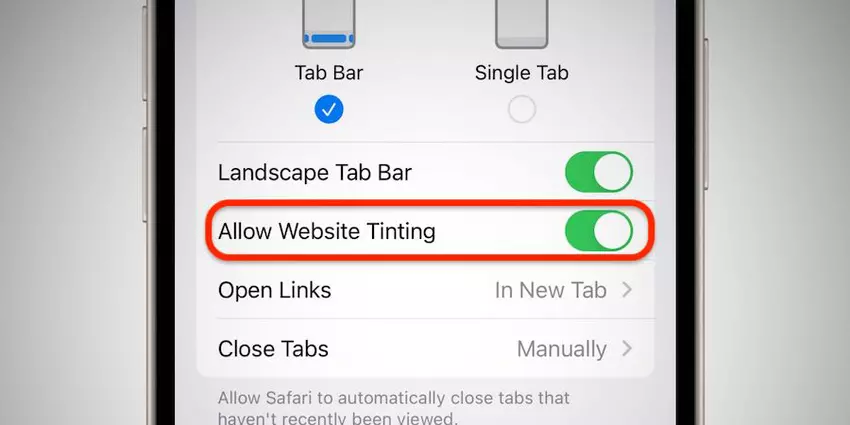 Anders als das Design der Safari-Adressleiste kann die Tönungsoption nur in den Einstellungen geändert werden. Gehen Sie zu Einstellungen -> Safari -> Tabs -> setzen Sie das Kontrollkästchen Website-Tonung zulassen auf Aus.
