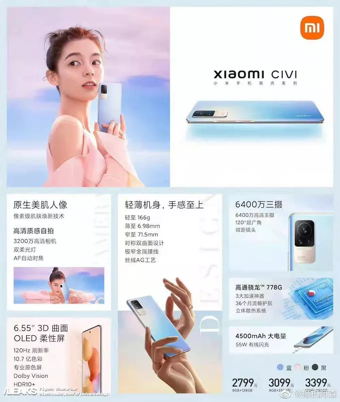 Erinnern Sie sich, dass Xiaomi Civi wird Snapdragon 778G Prozessor, 6,55 "OLED-Bildschirm von FHD + Format mit 120 Hz Bildwiederholfrequenz erhalten. Die Hauptkamera wird eine Auflösung von 64 MP + 8 MP + 2 MP haben, während die Frontkamera eine Auflösung von 32 MP haben wird. Das Smartphone wird außerdem einen 4.500mAh-Akku mit 55W drahtlosem Aufladen, Android 11, NFC, Stereo-Lautsprecher und MIUI 12.5-Firmware haben