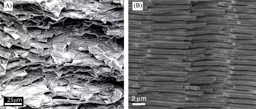 Die innere schimmernde Schicht einer Muschelschale ist das Geheimnis ihrer Stärke. Die mikroskopische Struktur dieses Materials, das als Perlmutt bezeichnet wird, ähnelt einem Mauerwerk: Platten aus hartem Kalziumkarbonat, die mit weichen, elastischen Biopolymeren durchsetzt sind. Diese Struktur erhöht nicht nur die Festigkeit, sondern verhindert auch die Ausbreitung von Rissen.