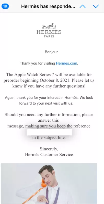 Ein Kunde Hermès hat eine E-Mail vom Kundendienst erhalten, in der es heißt, dass die Apple Watch Series 7 bereits am kommenden Freitag, dem 8. Oktober, vorbestellt werden kann. Der Verkauf der neuen Produkte wird voraussichtlich eine Woche später beginnen. Das ist, wie zuvor von Insider Jon Prossererklärt.
