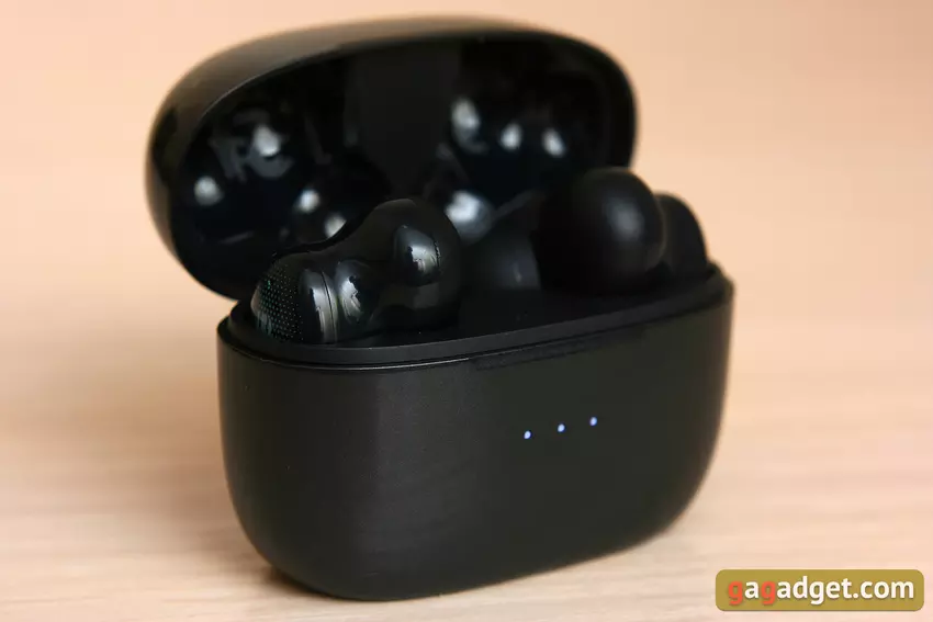 Um ehrlich zu sein, waren mir einige der Funktionen der LED-Anzeigen ein Rätsel. Nach einer Weile, nachdem die Kopfhörer wieder in der Box sind, blinken eine (rechts) oder zwei (rechts und links) LEDs gleichmäßig, es ist nicht klar, was sie signalisieren. Ich habe in der Bedienungsanleitung keine Beschreibung dieser Anzeige gefunden, aber es scheint, dass das Blinken der linken und rechten LED den Ladevorgang des Kopfhörers aus der Box anzeigt. Es gibt keine Farbanzeige, die LEDs sind immer weiß.