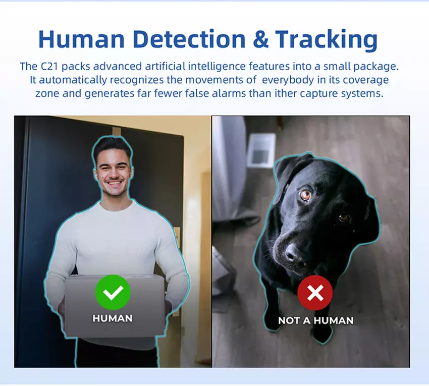 Die Kamera verfügt über eine Blende von f/2.0, eine Brennweite von 3,6 mm, einen Nachtmodus, eine Personenerkennungsfunktion im Rahmen sowie ein Mikrofon für Anrufe und einen Tonerkennungsmodus. Wenn zum Beispiel ein Kind weint, kann die Kamera eine Benachrichtigung an Ihr Smartphone senden.