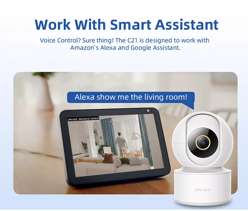 WarumEs ist das IMILAB C21. Sie hat ein Dome-Design und verfügt über ein Modul, das Tag und Nacht Videos mit einer Bildauflösung von 2,5K (2560×1440p) aufzeichnet. Sie können die Kamera in der App um 360 Grad drehen.