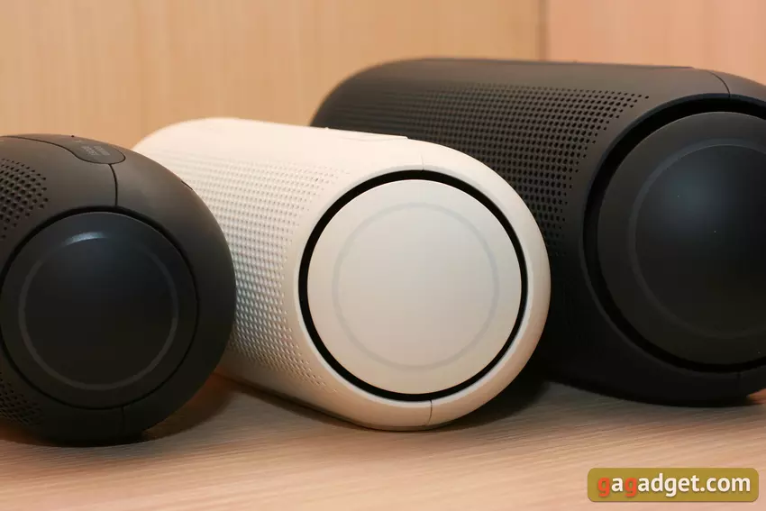Die PL5 und PL7 gibt es in schwarz oder weiß. Das LG XBOOM Go PL5 ist im Gegensatz zu seinem kleineren Cousin nicht nur größer, sondern unterscheidet sich auch in vielen Details. Die Kreise an den Seiten dienen nicht mehr nur der Schönheit, sondern sind bewegliche Elemente, die bei der Benutzung sichtbar vibrieren. Auch der Streifen um den Umfang jedes Diffusors ist keine Laune des Designers, sondern ein Detail der LED-Hintergrundbeleuchtung. Auf der Oberseite mit den Tasten sind die Unterschiede zum jüngeren Modell minimal, sie beschränken sich auf die erscheinende Akkuladeanzeige. Auf der Rückseite, hinter dem LG-Logo, befindet sich unter der starken Gummiabdeckung ein weiteres Bedienfeld. Es beherbergt die Dampf- und Multimodus-Power-Tasten, eine Taste für die Hintergrundbeleuchtung, ein Loch für die Reset-Taste, einen USB-C-Anschluss und einen 3,5-mm-AUX-Anschluss. Die Schutzhülle ist mit einem dicken Gummiband am Gehäuse befestigt, und die Konstruktion sieht ziemlich sicher aus.