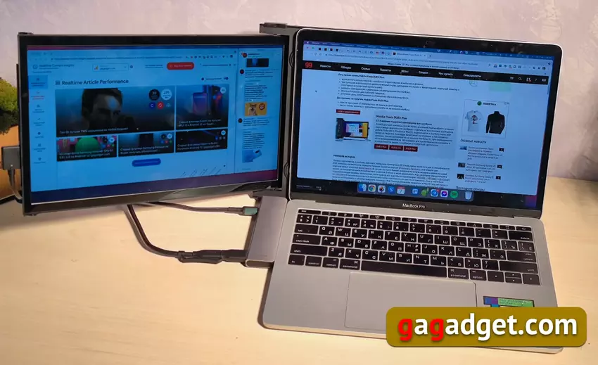 Die ersten tragbaren Monitore erschienen um 2010, kurz nachdem die USB-Stromübertragungsfähigkeit in den Spezifikationen auftauchte. Einer der ersten bemerkte Samsung, seine Modelle für Firmenkunden eingeführt HP, aber wie es oft der Fall ist, waren externe Monitore eine ziemlich enge Nische, mit spezifischen Kundenbedürfnissen. Infolgedessen hat sich Asus, das regelmäßig eine Reihe von tragbaren Monitoren aktualisiert und unterhält (wir hatten sogar ein paar Testberichte: MB168B und MB168B+ und ZenScreen GO MB16AP), in dieser Nische etabliert. Ich habe versucht, solche externen Monitore zu verwenden, aber irgendwie haben sie nicht gehalten. Ich habe auch versucht, ein iPad als externen Monitor zu verwenden. Diese Funktion wurde vor ein paar Jahren in macOS eingeführt und war, wenn ich mich recht erinnere, ab 2018 für macbooks verfügbar. Einerseits sah die Idee kurios aus: Das iPad wird als zweiter Bildschirm drahtlos angeschlossen. Andererseits braucht es immer noch Strom, und ja, auch einen Ständer. Außerdem hinkte bei dieser Verbindung alles unerbittlich hinterher, so dass ich diese Experimente aufgegeben habe.