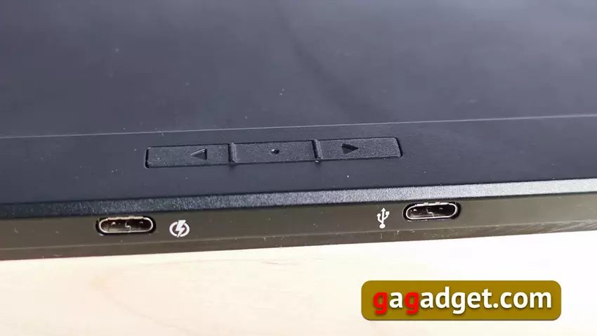 Der Monitor verfügt über ein eigenes einfaches Menü, das über drei Tasten am Gehäuse gesteuert wird. In der Nähe sind zwei USB-C-Anschlüsse zu sehen. Ich verstehe nicht wirklich, warum es zwei Anschlüsse gibt - einen nur für die Stromversorgung, der zweite ermöglicht sowohl die Strom- als auch die Bildübertragung, also habe ich natürlich nur diesen benutzt.