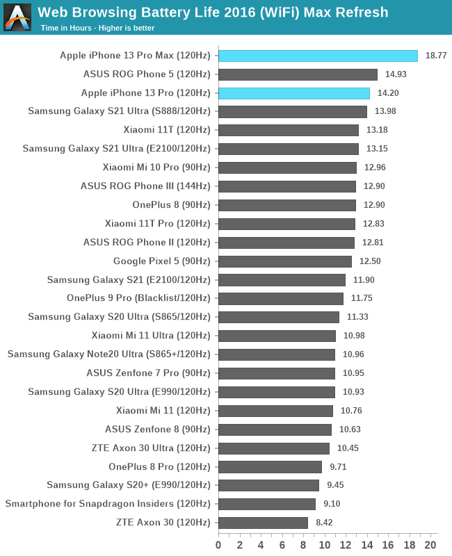 Bei aktivierter maximaler Bildwiederholrate hielt das iPhone 13 Pro Max etwa 3 Stunden weniger durch, behielt aber dennoch den Spitzenplatz. Außerdem hätte dies für den zweiten Platz im letzten Test gereicht. das iPhone 13 Pro bleibt mit 14 Stunden und 12 Minuten auf dem dritten Platz und verpasst damit das ASUS ROG Phone 5. Zu den Top Fünf gehören auch das Samsung Galaxy S21 Ultra und das neue Xiaomi 11T.