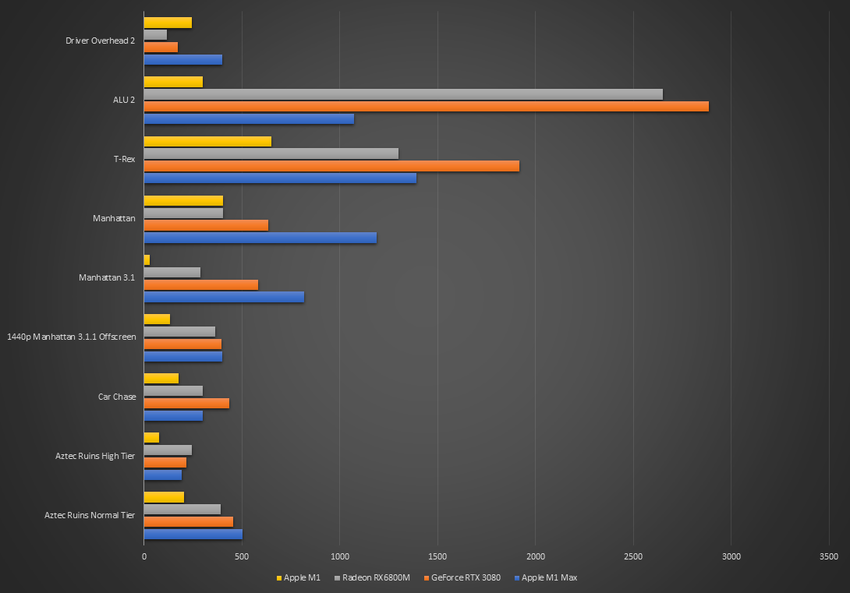 Die integrierte GPU des Apple M1 Max schneidet recht gut ab und liegt auf Augenhöhe mit der GeForce RTX 3080 und der Radeon RX 6800M. Außerdem war der integrierte Videochip in einigen Tests viel leistungsfähiger als die diskreten Grafikbeschleuniger. Zum Beispiel in Manhattan. Nur in ALU 2 hatten AMD- und NVIDIA-Karten keine Chance gegen M1 Max.