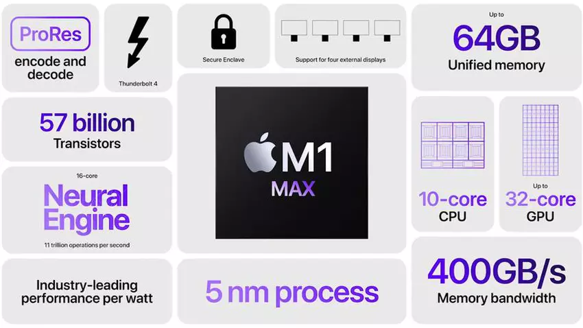 Apple sagte bei der Präsentation, dass die maximale theoretische GPU-Leistung des M1 Max 10,4 TFLOPS erreicht. Dies entspricht dem Niveau der mobilen diskreten Grafikkarte NVIDIA GeForce RTX 3060. Apple wies jedoch darauf hin, dass sein neuer Chip mit einem TGP von 60 W mit dem GeForce RTX 3080 konkurriert, der einen Stromverbrauch von 160 W hat. Nach Angaben des amerikanischen Herstellers liefert der M1 Max fast die gleiche Leistung, verbraucht aber 100 Watt weniger.