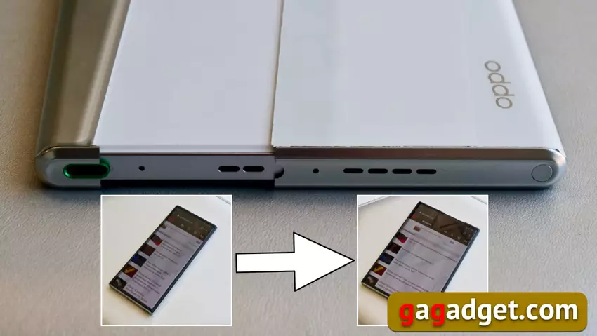Der offensichtliche Vorteil dieser technischen Lösung ist die Kompaktheit - im zusammengeklappten Zustand sieht das Smartphone deutlich dünner aus als im gefalteten Zustand. Die Ästhetik ist viel besser - die Falte auf einem Tisch ist im aufklappbaren Teil immer etwas dicker (wir haben einen separaten Text darüber, warum das so ist und wie es im Inneren aufgebaut ist). Die Nachteile liegen ebenfalls auf der Hand: Die zusätzlichen Motoren bedeuten mehr mechanische und bewegliche Teile, was sowohl den Verschleiß und die Zuverlässigkeit als auch die Stoßfestigkeit bei einem Sturz stark beeinträchtigt. Andere Fragen wirft die Bedienung beim Öffnen auf - mit dem Finger über das Touchpad zu streichen, scheint nicht die beste Lösung zu sein. Ja, und die Umwandlung des Bildschirms des OPPO X 2021 wird immer länger dauern als eine einfache Handbewegung, die den Fold zeigt. Unabhängig davon sollte man bedenken, dass mittelfristig, d. h. in einigen Jahren, solche Formfaktoren sowohl beim Fold als auch bei den OPPO X 2021-Nachfolgern immer teurer sein werden als ein Flip-Flop-Smartphone, wodurch die Zielgruppe kleiner wird. Das banale größere Display wird immer mehr kosten.