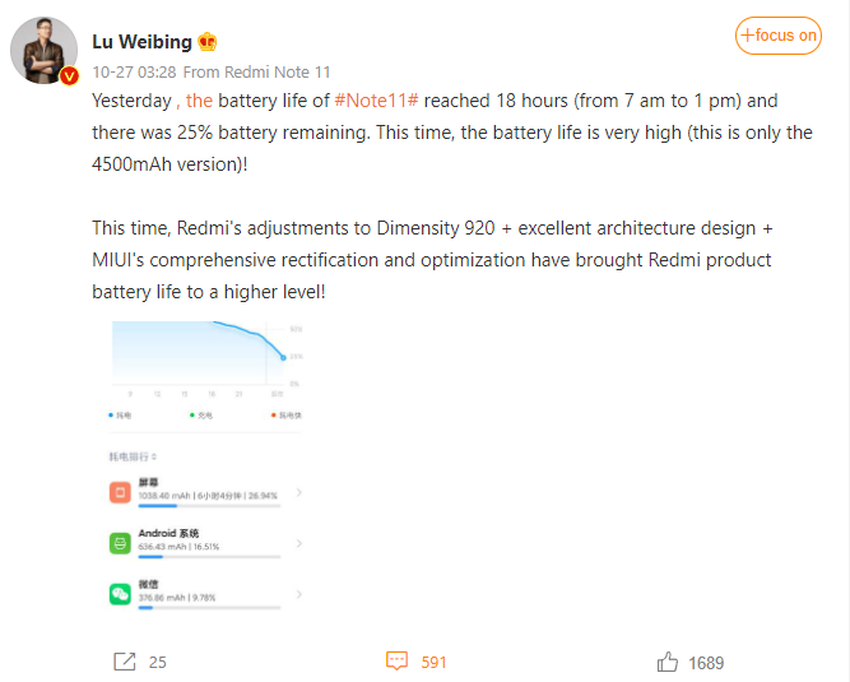 Der Manager schrieb, dass er das Redmi Note 11 18 Stunden lang benutzt hat und der Akku danach noch zu 25 % geladen war. Interessant ist, dass der Redmi-CEO darauf hinwies, dass diese Akkulaufzeit von der 4.500-mAh-Akku-Version geboten wird. Wir können also davon ausgehen, dass es auch eine Modifikation mit einem Akku höherer Kapazität geben wird.